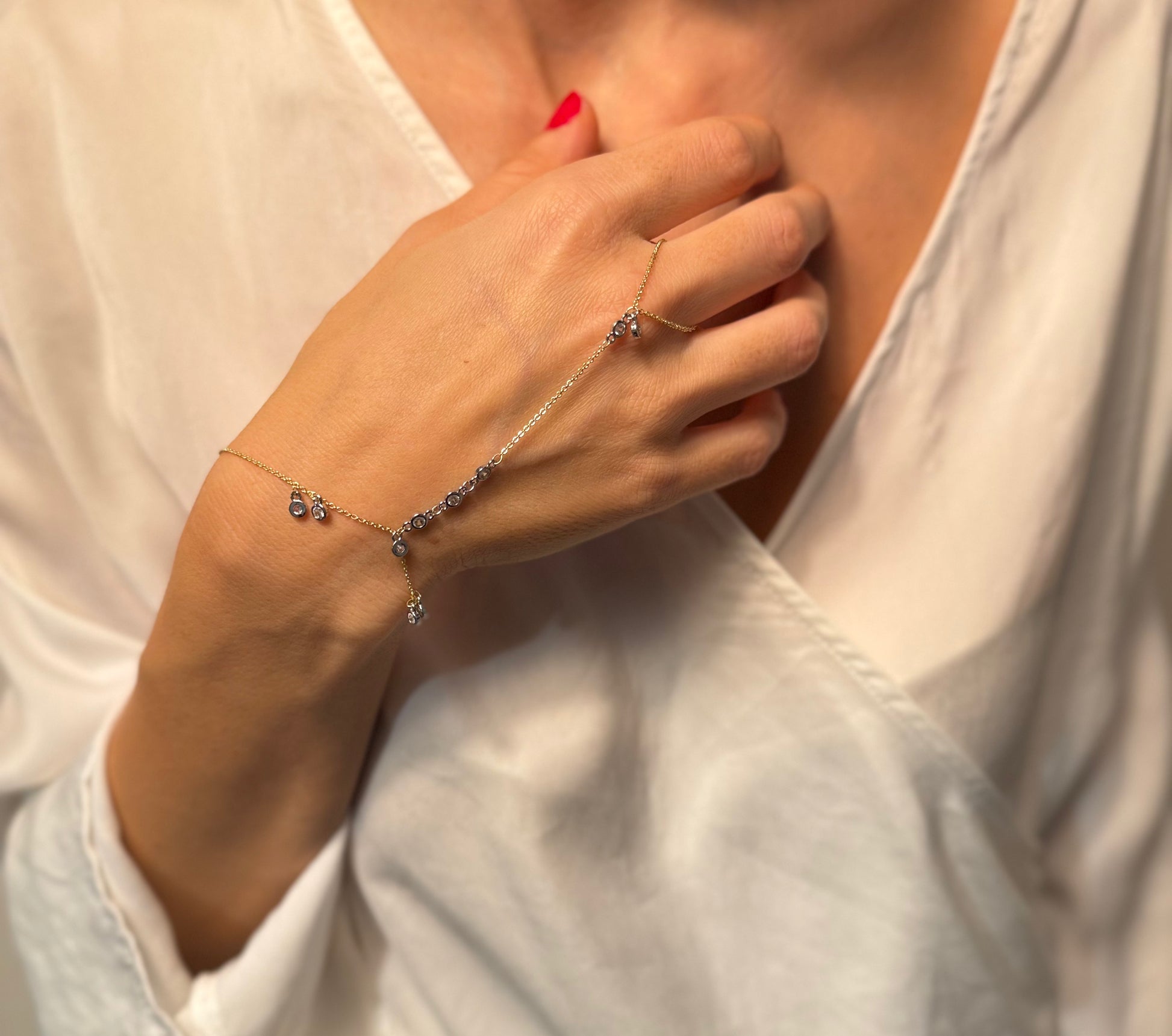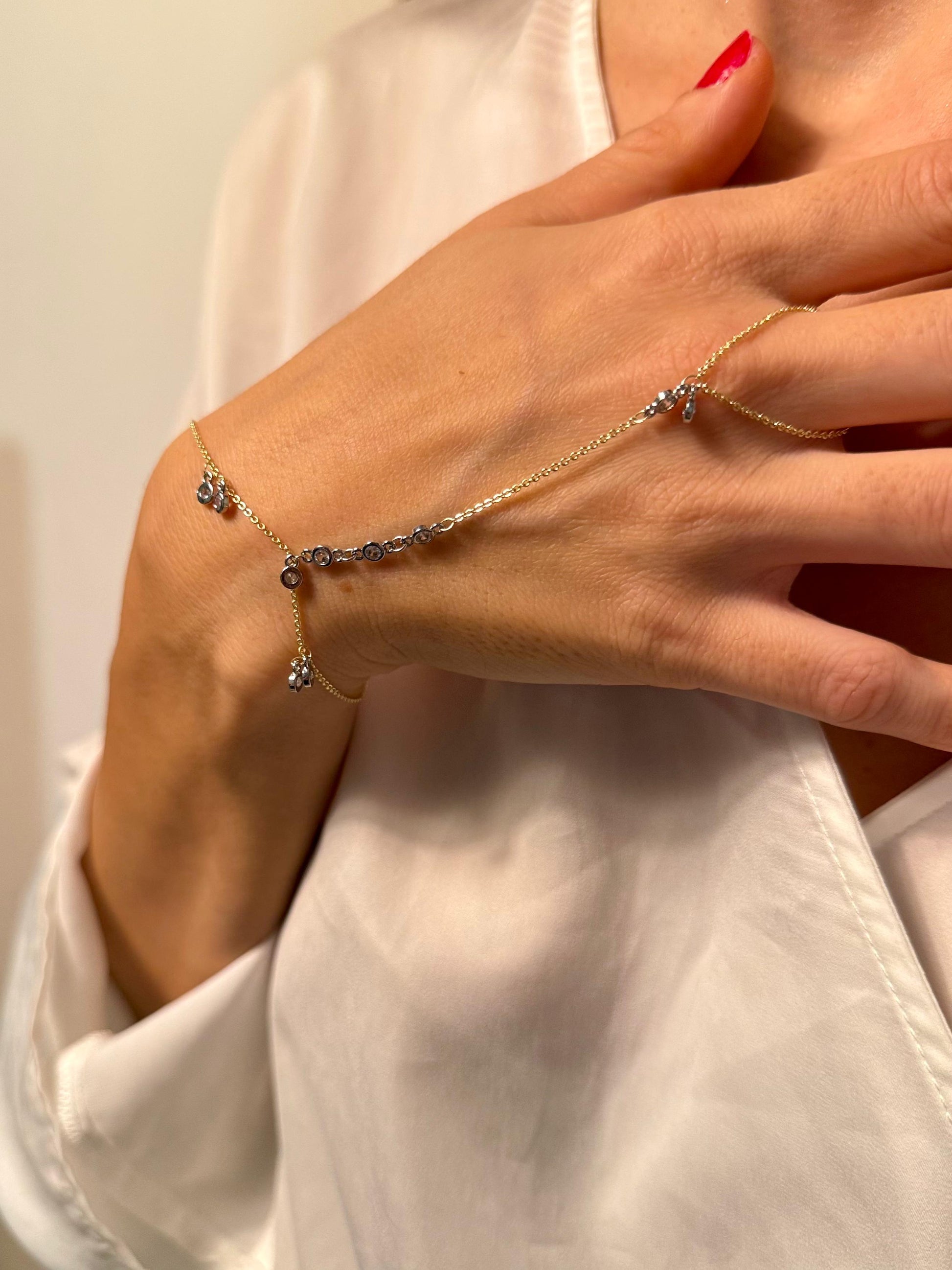 El zarafetini ön plana çıkaran bu şık şahmeran bilekten parmağa uzanan ince altın rengi zinciri ve ışıltılı taş detaylarıyla dikkat çekiyor. Minimalist ama göz alıcı tasarımı sayesinde hem günlük kombinlerde hem de özel davetlerde zarif bir dokunuş sunar.