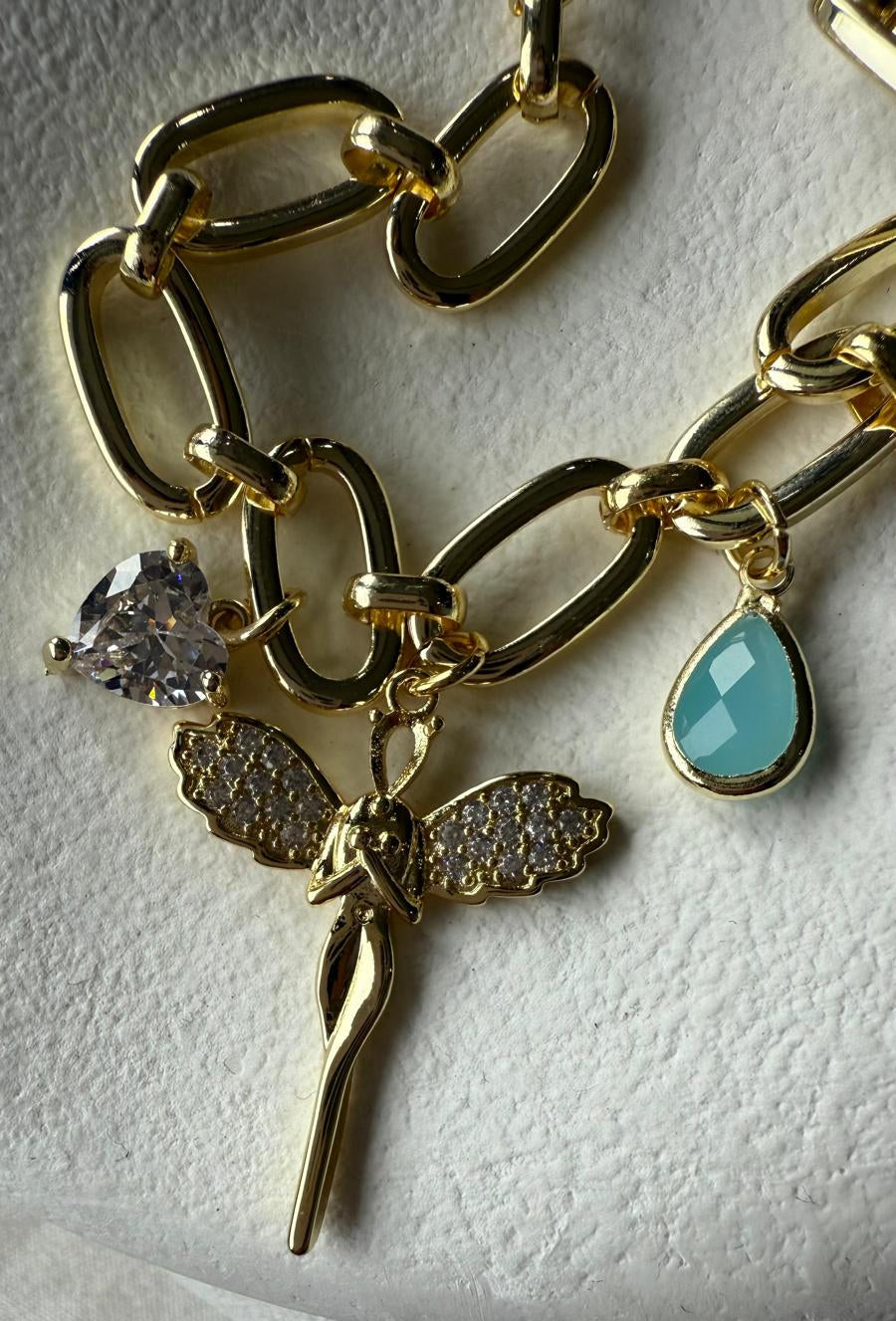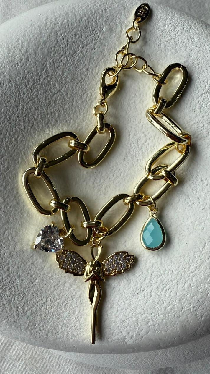 Melek figürü, parlak taşlarla süslenmiş kanatlarıyla asil ve romantik bir dokunuş sunar. Yanındaki kalp şeklindeki şeffaf taş charm ise zarafeti temsil eder. Mavimsi damla charm ise tasarıma taze, soft bir renk katarak bilekliği enerjik ve modern hale getirir.